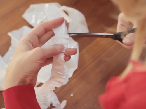 Das Band zwischen Daumen und Zeigefinger einspannen und in gleichmäßigen Abständen relativ weit einschneiden (VORSICHT: Nicht durchschneiden).