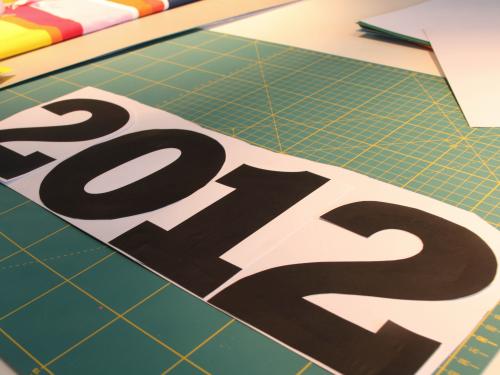 Druckt euch eine große „2012“ aus – das wird dann eure Schablone. Ich habe Größe 450 und die Schrift „Rockwell Extra Bold“ genommen. Zuerst die Zahl auf weiße Pappe kleben, damit sie stabiler wird.