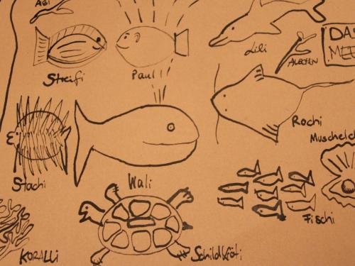 Wir haben erst Fische gemalt, denen Ludwig dann Namen gegeben hat. Danach haben wir das Ganze etwas abgewandelt und die Tiere noch bunt gemalt und Pop-up-Karten daraus gebastelt.