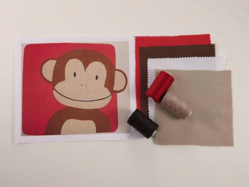 Dazu braucht ihr Stoffe in den jeweiligen Farben und dazu passendes Garn. Außerdem: Einen großen Ausdruck des Affen.