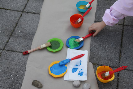 Erstmal Packpapier ausbreiten, Plastikschälchen mit Abtönfarbe füllen, pro Schüssel einen Pinsel bereitlegen. Was ihr noch braucht: Kittel für die Kinder, ein paar alte Kissen zum draufsitzen und eine lange Rolle Packpapier aus dem Baumarkt.