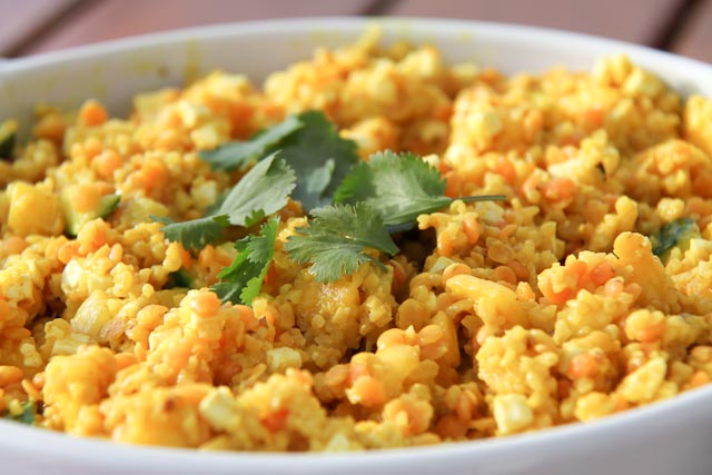 1. Öl in die Pfanne und die gewünschte Menge rote Linsen und Bulgur dazu. Ich bin gerade auf dem Aryuvedatrip – habe also anstatt Öl Ghee aus dem Bioladen genommen. Alles eine Minute anbraten. Dann Wasser dazu und quellen lassen. Immer wieder nachschütten, wenn das Wasser aufgesogen ist. Bulgur und Linsen brauchen ungefähr 6 Minuten Garzeit.