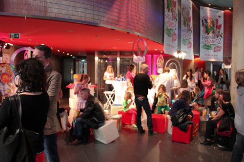 Im Foyer gab es dann eine Schminkecke, eine Ecke in der man sich fotografieren lassen konnte, ein Glücksrad mit Gewinnen und natürlich Eis, Popcorn und Getränke umsonst in rauhen Mengen.