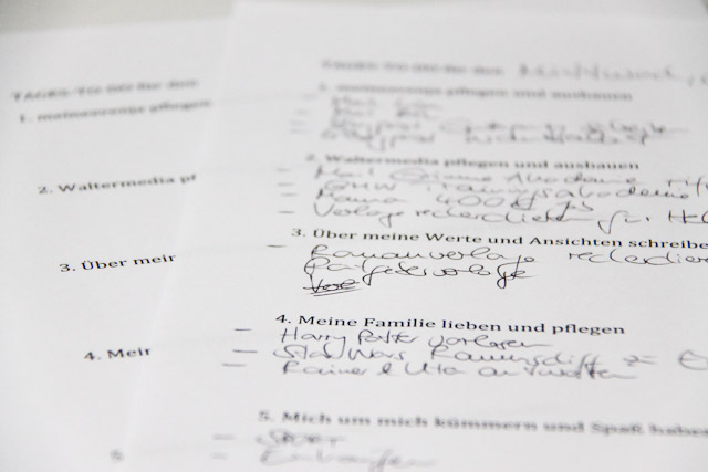 Jetzt würde das alles natürlich gar nichts bringen, wenn ich einfach nur diese Liste hätte und konfus rumwurschteln würde. Ich habe aber eben einen Zettel, auf dem diese Punkte aufgeführt sind und schreibe jeden Abend 5 Minuten in die einzelnen Kategorien, was ich morgen tun werde. Und ja, ihr lest richtig: JEDE Kategorie wird ausgefüllt. Nur „Anderes“ lasse ich manchmal frei, weil das sowieso von selbst kommt. Ich kümmere mich also an EINEM Tag um Blog, Firma, um das Schreiben, meine Familie, mein Zuhause und um mich selbst. Jetzt sagt ihr vielleicht: Das klingt aber stressig! So viel in einen Tag packen – wie machst Du das nur?