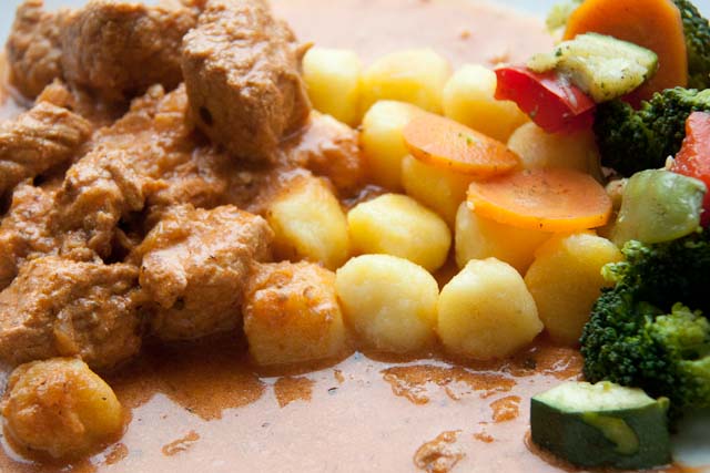 7. Varoma abnehmen, Schmand zum Schnitzelfleisch geben, 5 Sek./Linkslauf/Stufe 3 einrühren und mit Gemüse und Gnocchi servieren.