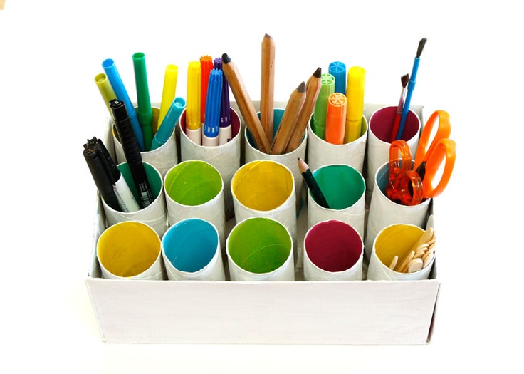 Eine leere Müslischachtel, viele bunt angemalte und beklebte Rollen – und schon habt ihr Ordnung auf dem Schreibtisch oder dem Maltisch eurer Kinder. Ja, das Basteln mit Klopapierrollen kann auch praktisch sein.