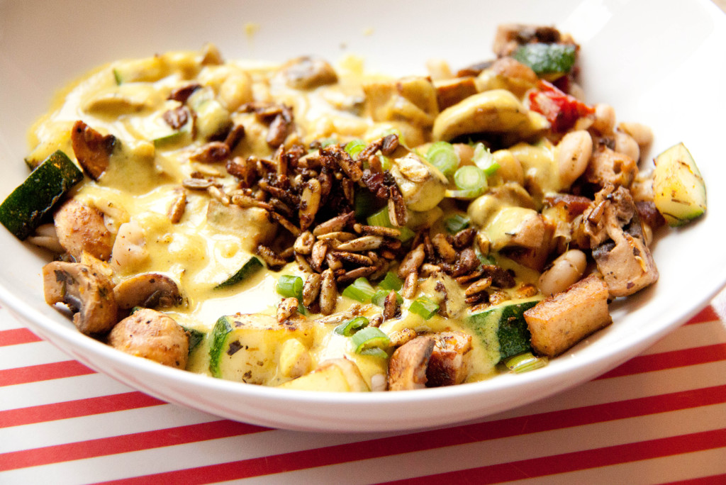 Im Aroma-Wunderland: Selbstkreierte vegane Pfanne mit indischer Soße und Sonnenblumenkern-Geröstl