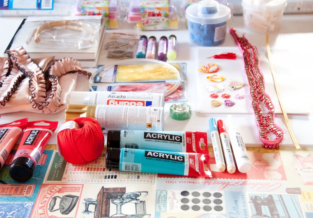Nicht, dass man auf dem Bild alles sehen würde, was ich für die nächsten Themen brauche. Das hier ist nur ein kleiner Ausschnitt. Nur für die Organisation der Materialien brauche ich bei knapp 20 Themen ungefähr 3-4 Arbeitstage. Heute z.B. war ich 5 Stunden in der Münchner Innenstadt. Bei Ludwig Beck geknöpft und zugenäht, in der Ludwig Beck Papeterie, bei Kautbullinger, bei idee creativ, im Wollladen, im Künstlerbedarf, in einem türkischen Stoffgeschäft und in der Handarbeitsabteilung von Karstadt am Haupbahnhof. Und nein: ich habe noch lange nicht alles zusammen.