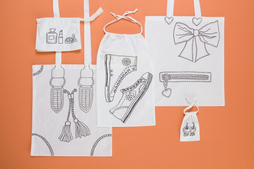 Ihr braucht: Weiße Baumwolltaschen, einen Bleistift, ein Radiergummi, einen Textilmarker (in diesem Fall Schwarz – ihr könnt natürlich auch jede andere Farbe nehmen), Fotos von verschiedenen Taschen oder anderen Motiven.