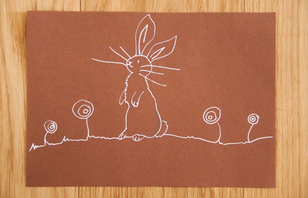 Sucht euch eine hübsche Hasenvorlage im Internet – ich bin bei belle & boo fündig geworden – und übertragt sie mit Bleistift auf ein braunes Papier. Natürlich kriegt man das nie so ganz genau hin, aber dass es ein Hase ist, erkennt man ja trotzdem.
