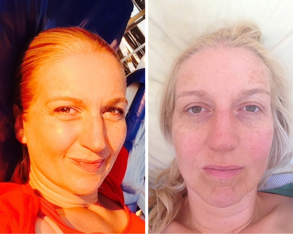 Oben seht ihr ein Foto von mir vor einer Woche im Uralub und eins am ersten Tag der Lebensmittelvergiftung, die ich mir offensichtlich zugezogen habe, weil der Salat mit irgendwas Widerlichem gespritzt war. Was soll ich sagen: dagegen habe ich mich nach meinen zwei Geburten wie nach einem Spaziergang gefühlt.