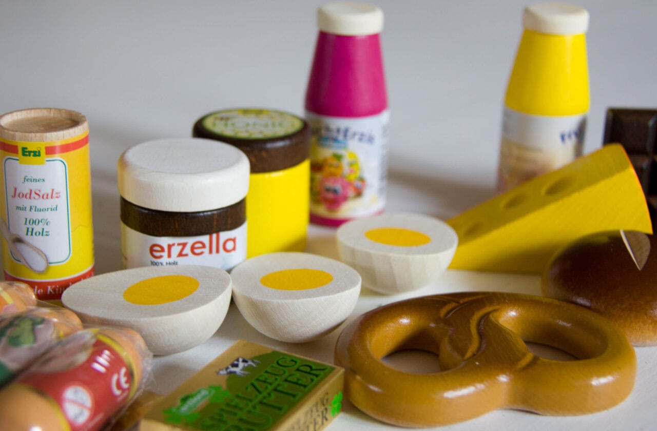 Als ich die Eichingers auf der Spielwarenmesse persönlich kennengelernt habe, war das nämlich auf dem Stand von Erzi . Das Unternehmen wird von Hartmut Eichingers Tochter, Nadja Stumm, geführt – und stellt Holzspielzeug in bester Qualität her (natürlich alles geprüft nach den aktuellen EU-Spielzeugnormen). Und falls ihr jetzt denkt: „Na das hört sich ja nicht besonders aufregend an!“… hier mal ein paar Impressionen der „normalen“ Kaufladenprodukte.