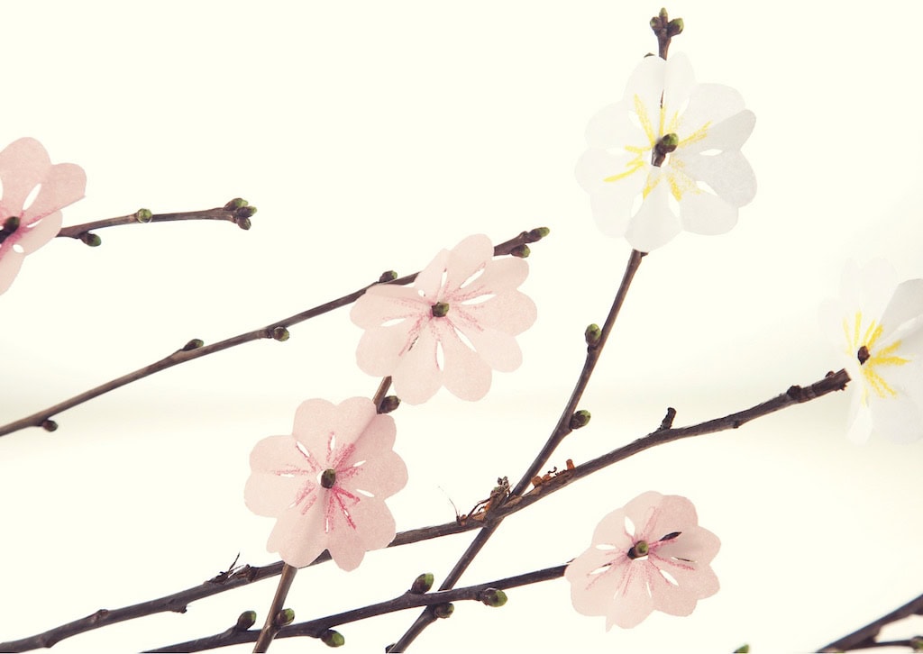 Dann wird gefaltet und geschnitten (wie zeige ich euch gleich in den Stepfotos) und dann TADAHHHH – steckt ihr die Kirschblüten auf Zweige. Achtet darauf, dass ihr welche mit vielen Knospen besorgt. Da halten die Blüten besonders gut. Alternativ könnt ihr sie auch mit Heißkleber befestigen. Wenn Osterdeko basteln doch nur immer so einfach und vor allem so hübsch wäre.